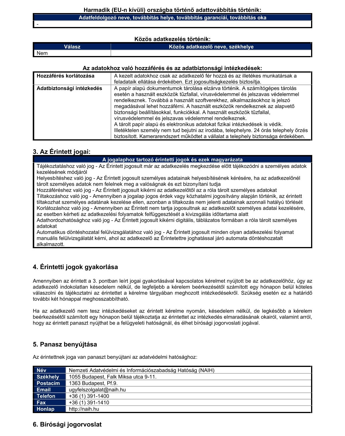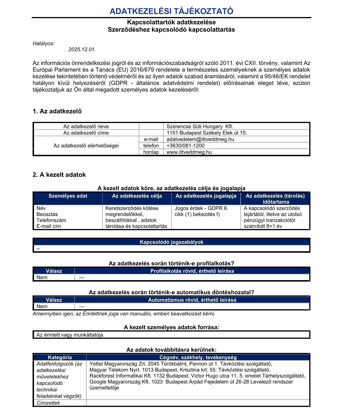 Adatkezelési tájékoztató - Kapcsolatfelvétel